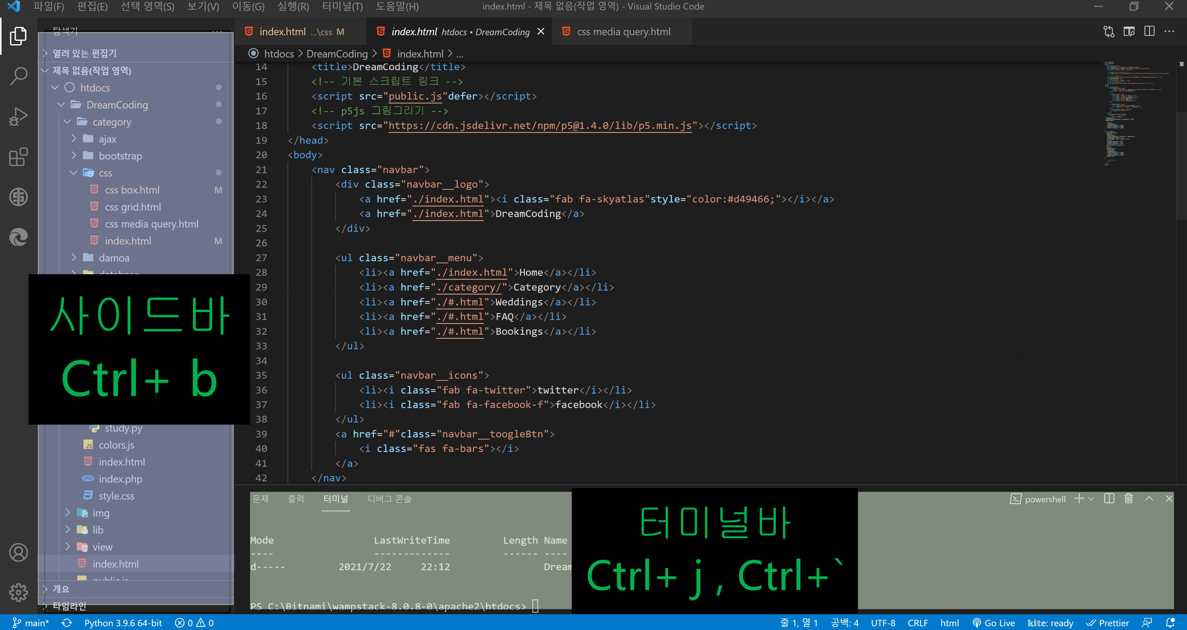 ■ 터미널바 표시/숨김: Ctrl+ j , Ctrl+`