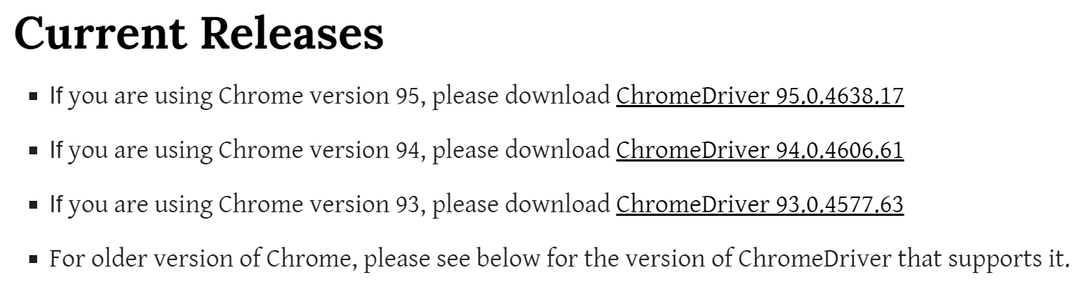 Current Releases 부분에서 자신의 크롬 버전과 맞는 것을 찾아서 설치합니다.